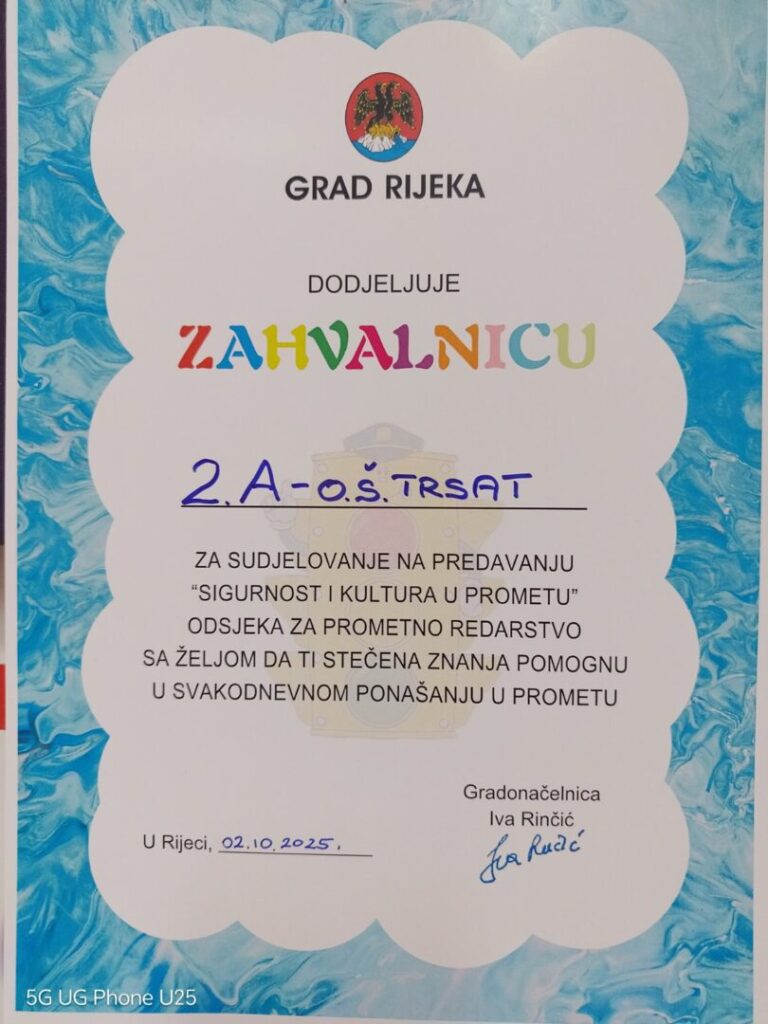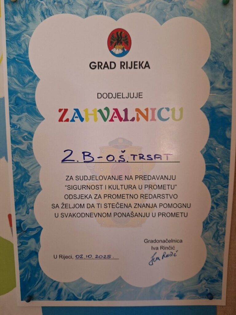 U četvrtak, 2. listopada 2025. godine za učenike 2. a i 2. b razreda održana je edukativna radionica “Sigurnost i kultura u prometu”. Radionicu provodi grad Rijeka – Odsjek za prometno redarstvo.